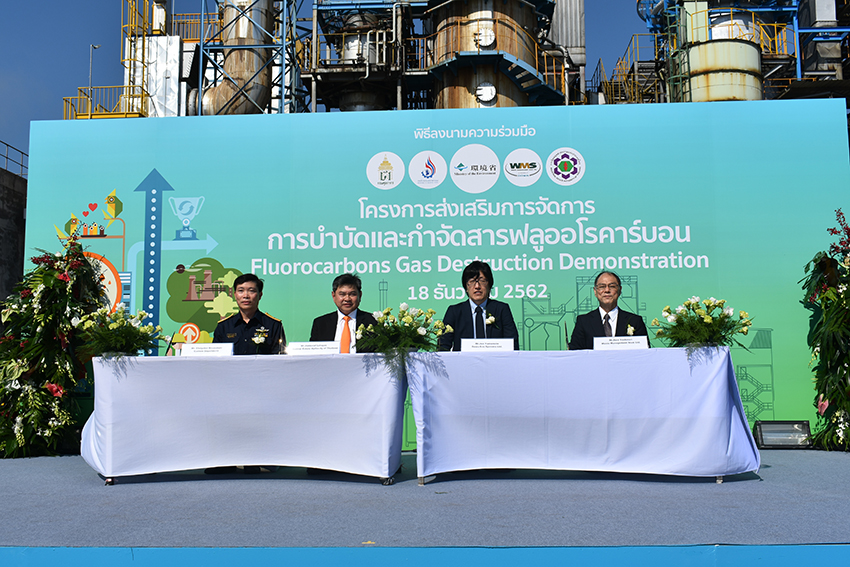 ซึ่งโครงการส่งเสริมการจัดการการบำบัดและกำจัดสารฟลูออโรคาร์บอน ได้มีพิธีลงนามความร่วมมือ โดยได้รับเกียรติจากผู้บริหารองค์กรพันธมิตร อาทิ นายจักรัฐ เลิศโอภาส รองผู้ว่าการการนิคมอุตสาหกรรมแห่งประเทศไทย (กนอ.) รวมถึง นายชัยยุทธ คำคุณ ที่ปรึกษาด้านพัฒนาระบบควบคุมทางศุลกากร กรมศุลกากร นอกจากนี้ ยังมีตัวแทนจากประเทศญี่ปุ่น ประกอบด้วย นายโยชิโนริ ซูกา ผู้แทนถาวรอันดับหนึ่ง สถานทูตญี่ปุ่นประจำประเทศไทย ตลอดจน นายจุน ยามาโมโตะ ผู้แทนจากบริษัท โดวะ อีโค่ซิสเต็มส์ จำกัด และ นายอาคิโอะ โยชินาริ ประธานกรรมการบริษัท เวสท์ แมเนจเม้นท์ สยาม จำกัด