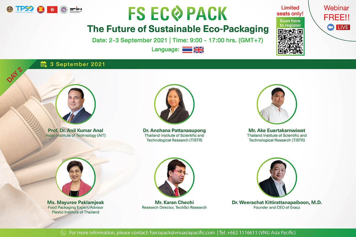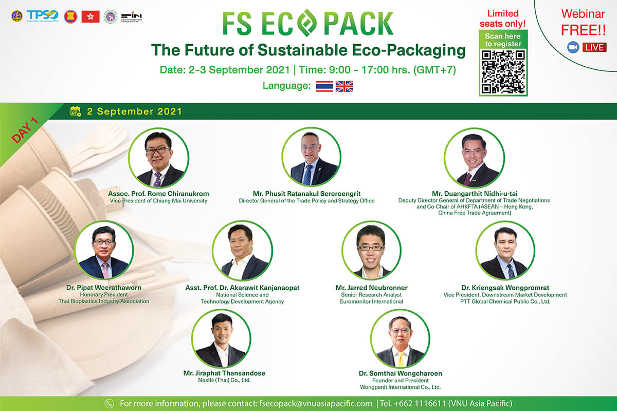 ขอเชิญชวนผู้ที่สนใจ ทั้งผู้ประกอบการ SMEs ธุรกิจบรรจุภัณฑ์ที่เป็นมิตรกับสิ่งแวดล้อมในไทยและอาเซียน เกษตรกรในไทยและอาเซียน SMEs ในธุรกิจการเกษตร ผู้แทนจากหน่วยงานที่เกี่ยวข้องจากภาครัฐ ภาคเอกชน ผู้ประกอบการที่เกี่ยวข้องกับธุรกิจอาหารที่ต้องใช้บรรจุภัณฑ์ ผู้ประกอบการที่ส่งเสริมบรรจุภัณฑ์ที่เป็นมิตรกับสิ่งแวดล้อม กลุ่มสหกรณ์ และธุรกิจที่มีความต้องการใช้บรรจุภัณฑ์ มาร่วมกิจกรรมจับคู่ธุรกิจในงาน The Future for Sustainable Eco-Packaging (Webinar) กำหนดการจัดงานระหว่างวันที่ 2-3 กันยายน 2564 ตั้งแต่เวลา 09:00-17:00 น. ในรูปแบบงานสัมมนาออนไลน์เต็มสองวัน พร้อมด้วยกิจกรรมการจับคู่ธุรกิจผ่านระบบออนไลน์ระหว่างเวลา 15:00-17:00 น. สอบถามรายละเอียดเพิ่มเติม โทร. 02-1116611 ต่อ 213 อีเมล fsecopack@vnuasiapacific.com