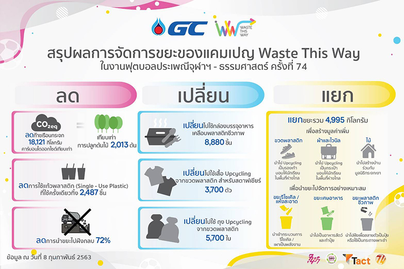 ฟุตบอลจุฬาฯ – ธรรมศาสตร์ ครั้งที่ 74 ปลุกพลังคนรุ่นใหม่ สู่เส้นทาง Make a CHANGE รักษ์โลก ด้วยแคมเปญ Waste This Way ลดขยะพลาสติก ปลื้มตัวเลขวัดผล “ลด เปลี่ยน แยก” 1วัน ลดก๊าซคาร์บอนฯ ได้กว่า 18,000 กิโลกรัมคาร์บอน เทียบเท่าปลูกต้นไม้ กว่า 2,000 ต้น ลดขยะกว่า 2,000 ชิ้น ลดการฝังกลบ ถึง 72 % GC พร้อมพลิกโฉมขยะพลาสติกรีไซเคิลเป็นรองเท้ากีฬา กระเป๋า ส่งต่อเยาวชนที่ห่างไกล