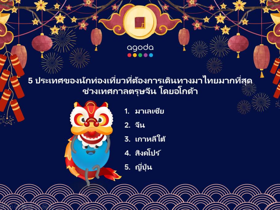 ข้อมูลการจองห้องพักของอโกด้ายังแสดงให้เห็นว่านักท่องเที่ยวจากมาเลเซีย จีน เกาหลีใต้ สิงคโปร์ และญี่ปุ่นเป็น 5 อันดับแรกที่มาท่องเที่ยวในไทยมากที่สุดตามลำดับ นับเป็นครั้งแรกตั้งแต่ปี 2019 ที่จีนกลับเข้ามาอยู่ใน 5 อันดับแรก ส่วนจุดหมายปลายทางยอดฮิตในไทย 5 อันดับแรกสำหรับนักท่องเที่ยวต่างชาติ ได้แก่ กรุงเทพฯ ภูเก็ต หาดใหญ่ พัทยา และเชียงใหม่ตามลำดับ