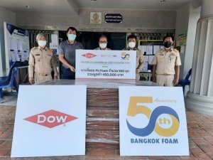 ส่วนบริษัท บางกอกโฟม จำกัด ได้มอบเบาะที่นอนโพลียูรีเทนโฟม (PU Foam) อย่างดี ซึ่งผลิตจากโพลียูรีเทนของ Dow พร้อมหุ้มวัสดุ PVC ที่สามารถทำความสะอาดได้ง่าย เพื่อลดการสะสมเชื้อโรคของที่นอน จำนวน 500 ชุด มูลค่ากว่า 450,000 บาท สนับสนุนโรงพยาบาลสนามและศูนย์พักคอยในจังหวัดระยอง