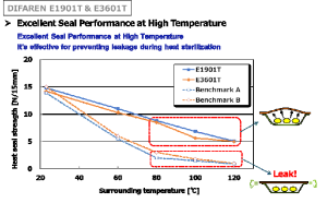 - E 1901T เป็นฟิล์ม PP ที่สามารถทนความร้อน (heat and retort) ได้ถึง 125 องศาเซลเซียส ทนความเย็นได้ที่ 0 องศา เซลเซียส
