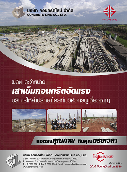 บริษัท คอนกรีตไลน์ จำกัด เป็น โรงงานผลิตเสาเข็มคอนกรีตอัดแรง CONCRETELINE ผลิต จำหน่าย และรับเหมาตอก เสาเข็มคอนกรีตรูปตัวไอ เสาเข็มคอนกรีตรูปสี่เหลี่ยม มาตรฐาน มอก.396-2548 กำลังการผลิต 2.8 แสนลูกบาศก์เมตรต่อปี มีสต็อกพร้อมส่งทันที
