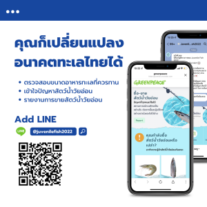 กรีนพีซ ประเทศไทย ร่วมกับภาคีเครือข่ายองค์กรภาคประชาสังคมเพื่ออาหารทะเลเพื่อความยั่งยืนและเป็นธรรม เปิดตัวแพลตฟอร์มสัตว์น้ำวัยอ่อนบนแอปพลิเคชั่น ไลน์ (LINE) ช่วยผู้บริโภคเลือกผลิตภัณฑ์ที่เป็นมิตรกับทะเล และมีส่วนร่วมในการแก้วิกฤติทะเลและประมง โดยช่วยรายงานการจำหน่ายสัตว์น้ำที่ไม่ได้ขนาด