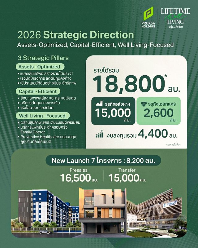 “ในปี 2569 นี้ เราตั้งเป้าหมายรายได้รวมที่ 18,800 ล้านบาท เป็นรายได้จากธุรกิจอสังหาริมทรัพย์ 15,000 ล้านบาท และรายได้จากธุรกิจเฮลท์แคร์ 2,600 ล้านบาท พร้อมอัดงบลงทุน 4,400 ล้านบาท เพื่อรองรับการขยายธุรกิจ และในปีนี้เราวางกลยุทธ์ต่อเนื่องภายใต้ Reshaping Portfolio โดยมุ่งเน้น 3 แกนหลัก “Asset-Optimized · Capital-Efficient · Well Living-Focused” มุ่งยกระดับประสิทธิภาพการใช้สินทรัพย์และโฟกัสพอร์ตการลงทุนเพื่อความคล่องตัวทางการเงิน และต่อยอดความได้เปรียบเชิงแบรนด์จากการผสานธุรกิจที่อยู่อาศัยและเฮลท์แคร์เข้าด้วยกันอย่างเป็นระบบ จุดแข็งสำคัญของพฤกษาคือ การเป็นผู้พัฒนาอสังหาริมทรัพย์รายเดียวที่มีธุรกิจโรงพยาบาลในเครือ ซึ่งทำให้เราสามารถสร้างความแตกต่างผ่านการเชื่อมโยง ‘บ้าน’ กับ ‘การดูแลสุขภาพ’ ได้อย่างครบวงจร เพื่อขับเคลื่อนการเติบโตที่มีคุณภาพและยั่งยืนในระยะยาว ภายใต้ทิศทางธุรกิจที่ชัดเจนและมั่นคง” นางสาวปัทมา กล่าว