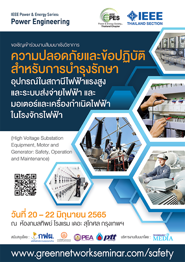 สมาคมไฟฟ้าและพลังงานไอทริปเปิลอี (ประเทศไทย) หรือ IEEE- Power & Energy Society – Thailand Chapter โดยการสนับสนุนด้านวิชาการ จาก กฟน., กฟภ. และ กฟผ. มหาวิทยาลัยและบริษัทเอกชน (Solution Providers) ขอเชิญชวนผู้สนใจเข้าร่วมสัมมนาเชิงวิชาการเรื่อง “ความปลอดภัยและ ข้อปฏิบัติสําหรับการบํารุงรักษาอุปกรณ์ในสถานีไฟฟ้าแรงสูงและระบบส่งจ่าย ไฟฟ้า และมอเตอร์และเครื่องกําเนิดไฟฟ้าในโรงจักรไฟฟ้า” ในระหว่างวันที่ 20-22 มิถุนายน 2565 ณ ห้องกมลทิพย์ โรงแรม เดอะ สุโกศล กรุงเทพฯ