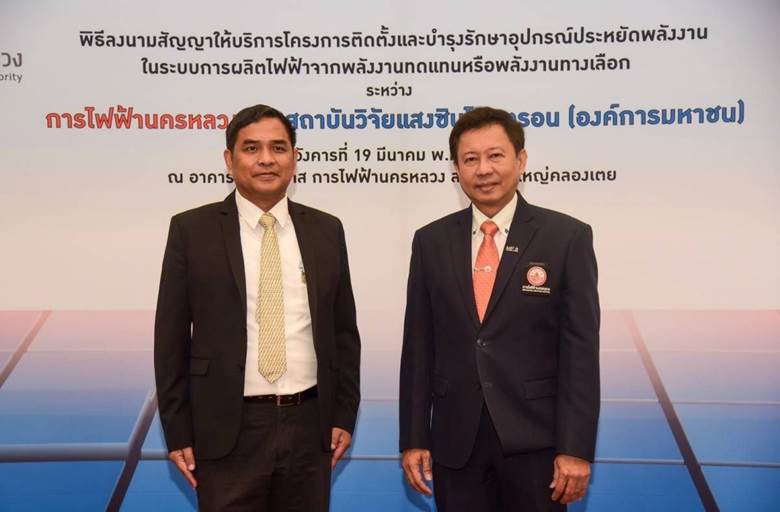 รศ.ดร.สาโรช รุจิรวรรธน์ ผู้อำนวยการสถาบันวิจัยแสงซินโครตรอน และจาตุรงค์ สุริยาศศิน รองผู้ว่าการธุรกิจ การไฟฟ้านครหลวง ร่วมลงนามในสัญญาให้บริการโครงการติดตั้งและบำรุงรักษาอุปกรณ์ประหยัดพลังงานในระบบการผลิตไฟฟ้าจากพลังงานทดแทน หรือพลังงานทางเลือก ในพื้นที่สถาบันวิจัยแสงซินโครตรอน (องค์การมหาชน) วันที่ 19 มีนาคม 2567 ณ อาคารวัฒนวิภาส การไฟฟ้านครหลวง สำนักงานใหญ่คลองเตย