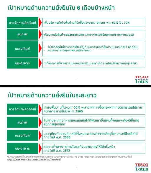 สำหรับเป้าหมายด้านความยั่งยืนในระยะยาวนั้น ประกอบด้วย การจัดหาผลิตภัณฑ์ ที่จะเพิ่มปริมาณผักใบพื้นบ้านทั้งหมาด 100% จะมาจากการรับซื้อตรงจากเกษตรกรโดยไม่ผ่านคนกลาง จาก 60% เป็น 70% ภายในปี พ.ศ. 2565 ขณะที่นโยบายเรื่องของสุขภาพนั้น สินค้าประเภทอาหารแบรนด์เทสโก้ที่พัฒนาขึ้นใหม่ทั้งหมด จะต้องดีขึ้นต่อสุขภาพของผู้บริโภค โดยพัฒนากลุ่มสินค้า Balanced และอ่าหารเจพร้อมทานปราศจากผงชูรส นอกจากนี้ด้านบรรจุภัณฑ์ มีนโยบายยกเลิกการใช้หลอดพลาสติกทั้งหมด ซึ่งในปี 2563 จะเริ่มเดินหน้าในการใช้วัสดุจากธรรมชาติ หรือจะต้องทำจากวัสดุที่สามารถรีไซเคิลได้มาผลิตแทนหลอดพลาสติก ภายในปี พ.ศ. 2568 และเป้าหมายเร่งด่วนด้านความยั่งยืนระยะยาวที่เทสโก้ โลตัส มุ่งเดินหน้าแก้ปัญหา คือ ขยะอาหาร โดยกำหนดลดการทิ้งอาหารภายในธุรกิจของเทสโก้ลงให้ได้ครึ่งหนึ่งภายในปี พ.ศ. 2573 และไม่ทิ้งอาหารที่จำหน่ายไม่หมด แต่ยังรับประทานได้จากไฮเปอร์มาร์เก็ตทุกสาขา