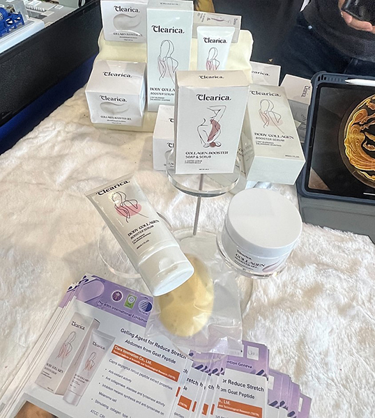 2) ผลิตภัณฑ์เจลลิ่งเพื่อลดรอยแตกลายผิวหนังหน้าท้องด้วยสารสกัดเพปไทด์จากแพะ โดย บริษัท Clara Innovation Co., Ltd. and ODEESTYLE CO.,LTD. ร่วมกับ นางสาวอุบล ฤกษ์อ่ำ และดร.ศรัญญา เหล่าวิทยางค์กูร นักวิจัยอาวุโส ศนส. ผลิตภัณฑ์มีส่วนประกอบของสารสกัดเพปไทด์จากหนังแพะและอุ้งเท้าแพะ ที่เป็นส่วนเหลือทิ้งจากการแปรรูปเนื้อแพะแช่แข็ง มีขนาดของโมเลกุลขนาดเล็ก 2-5 kD และมีกรดอะมิโนชนิด proline, Arginine และ glycine เป็นหลัก มีประสิทธิภาพในการยับยั้งอนุมูลอิสระได้เทียบเท่าวิตามินซีที่ความเข้มข้น 100 ไมโครกรัม/มิลลิลิตร และมีฤทธิ์ในการยับยั้งเอนไซม์ไทโรซิเนส อิลาสเตสและ คอลลาจิเนส มีฤทธิ์กระตุ้นการสร้างคอลลาเจนและยับยั้งสารสื่ออักเสบเมื่อทำการทดสอบในเซลล์ ผลิตภัณฑ์อยู่ในรูปแบบเจล มีคุณสมบัติช่วยให้ผิวอุ้มน้ำได้ดี สมานริ้วรอย กระชับเซลล์ผิวหนัง และรอยด่างดำที่ผิวหนังหน้าท้องของสตรีหลังคลอดบุตร